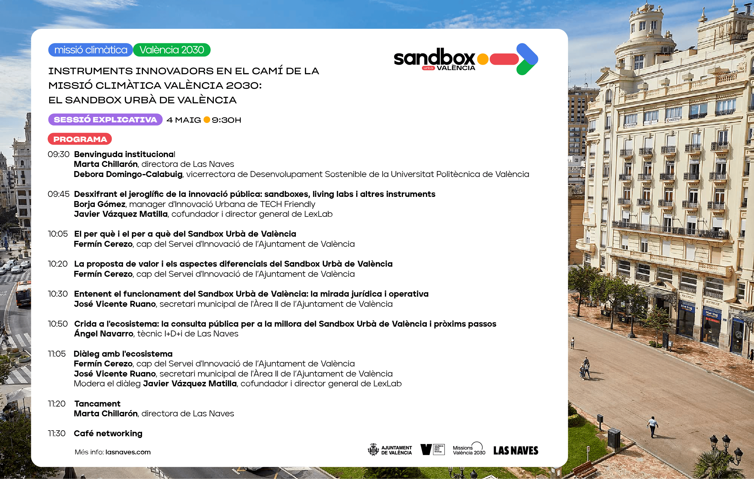 |  | | | | | | El Ajuntament de València se prepara para recibir una sesión explicativa sobre la ordenanza del sandbox, la cual se llevará a cabo el próximo jueves 4 de mayo a las 9:30 en Las Naves, centro de innovación social y urbana del municipio.   Con la implementación de este sandbox, se busca establecer un marco legal para el desarrollo de proyectos innovadores en un entorno controlado, permitiendo a las empresas experimentar con nuevas tecnologías y modelos de negocio sin estar sujetas a las regulaciones existentes. |
